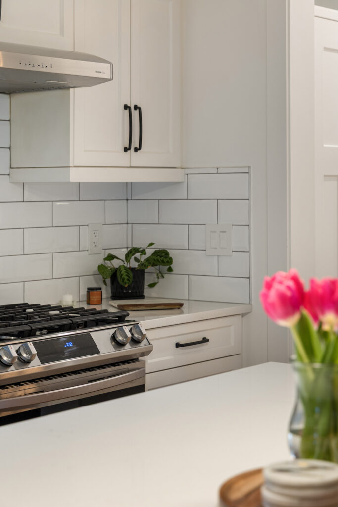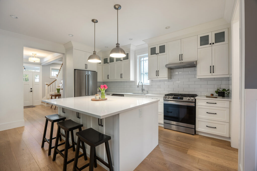 The well-appointed kitchen offers a large central island perfect for gathering and entertaining.