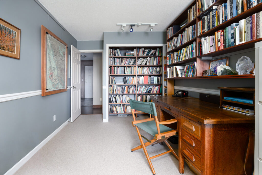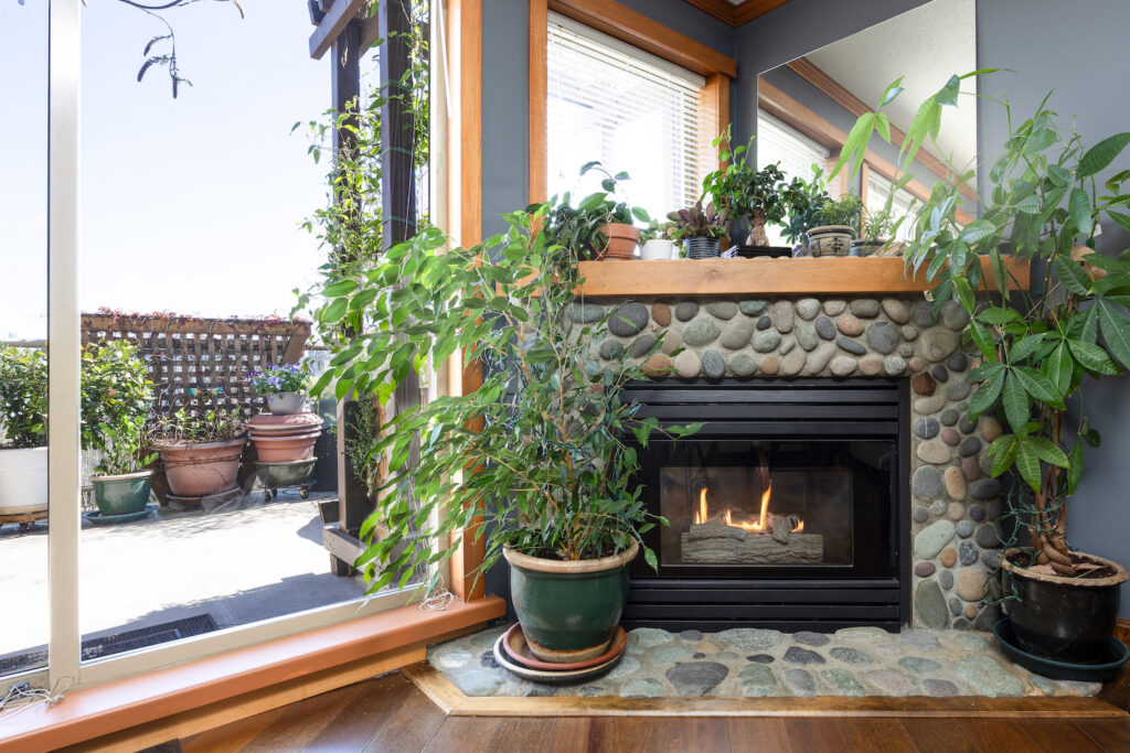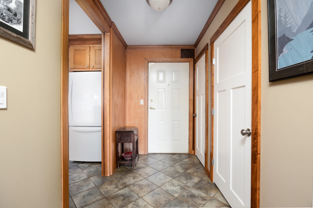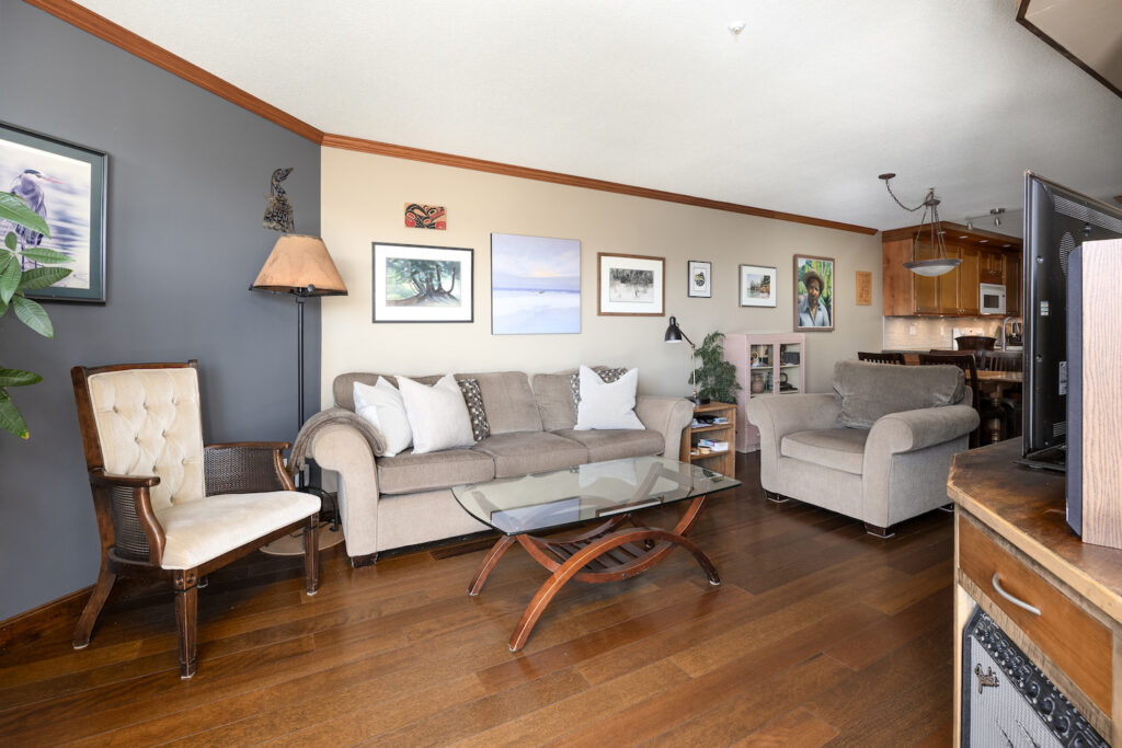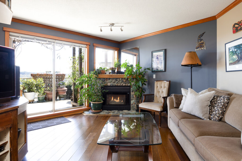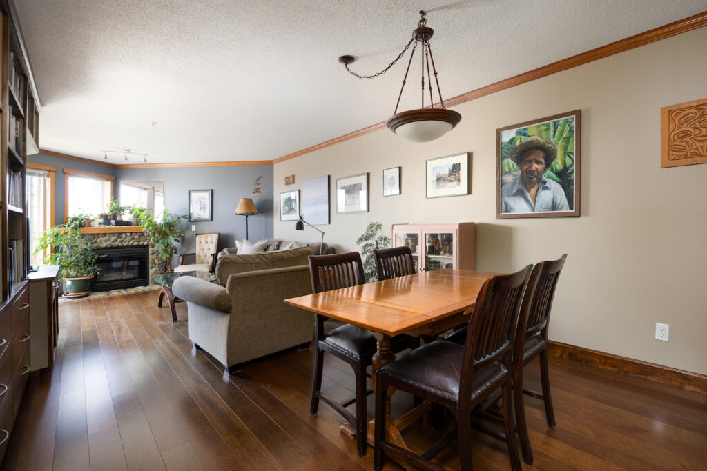 This two bedroom and one bathroom home offers 1,065 square feet of living space with an open concept living/dining room complete with a cosy gas fireplace with river rock surround, custom built-ins and hardwood floors.