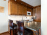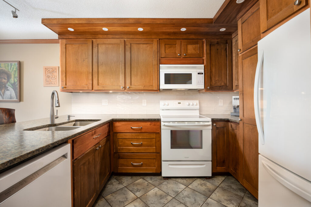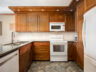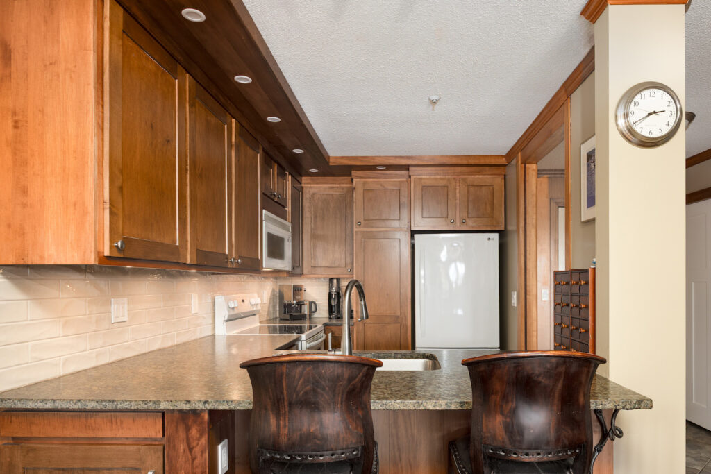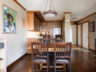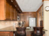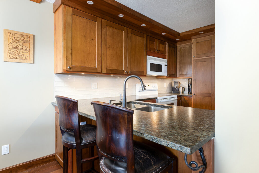 The tastefully updated kitchen features labradorite counters, custom cabinetry and breakfast bar.